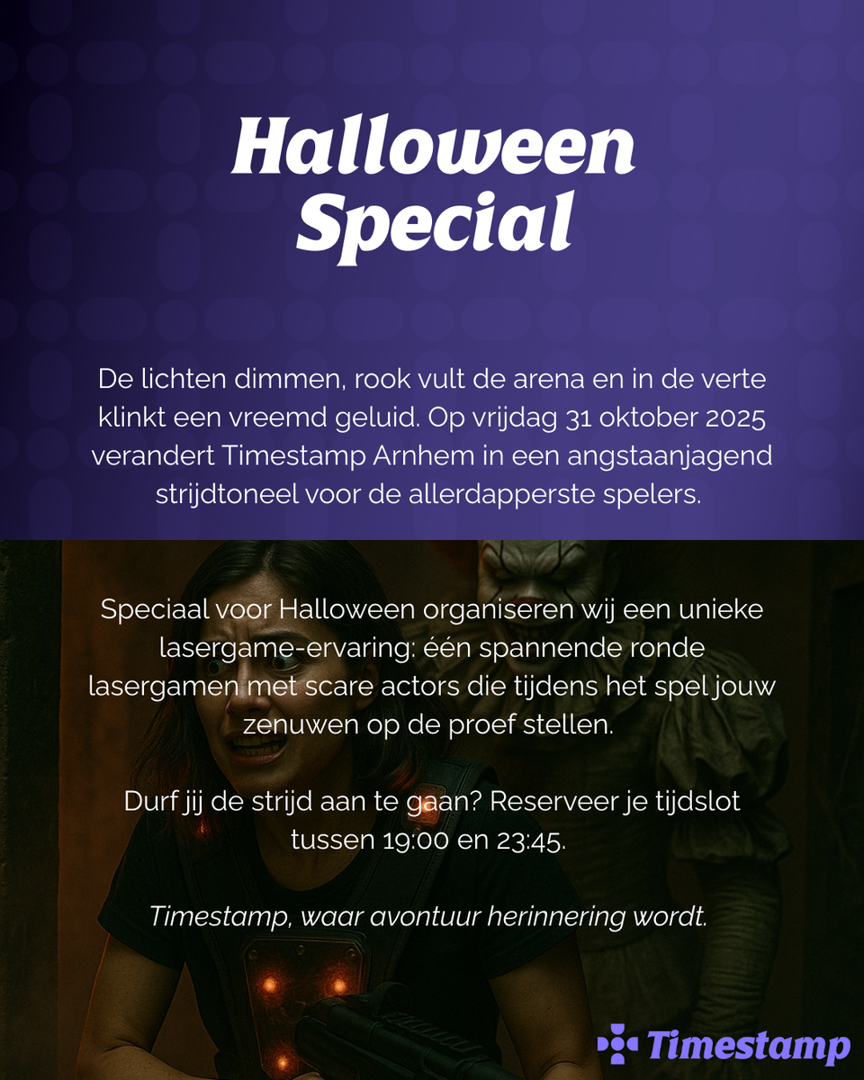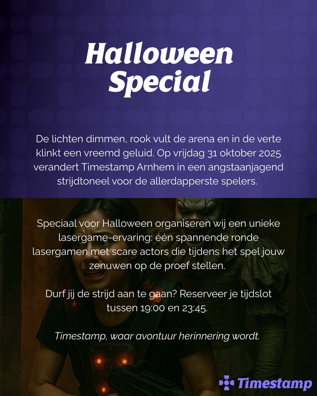 De lichten dimmen, rook vult de arena en in de verte klinkt een vreemd geluid. Op vrijdag 31 oktober 2025 verandert Timestamp Arnhem in een angstaanjagend strijdtoneel voor de allerdapperste spelers. Speciaal voor Halloween organiseren wij een unieke lasergame-ervaring: één spannende ronde lasergamen met scare actors die tijdens het spel jouw zenuwen op de proef stellen.