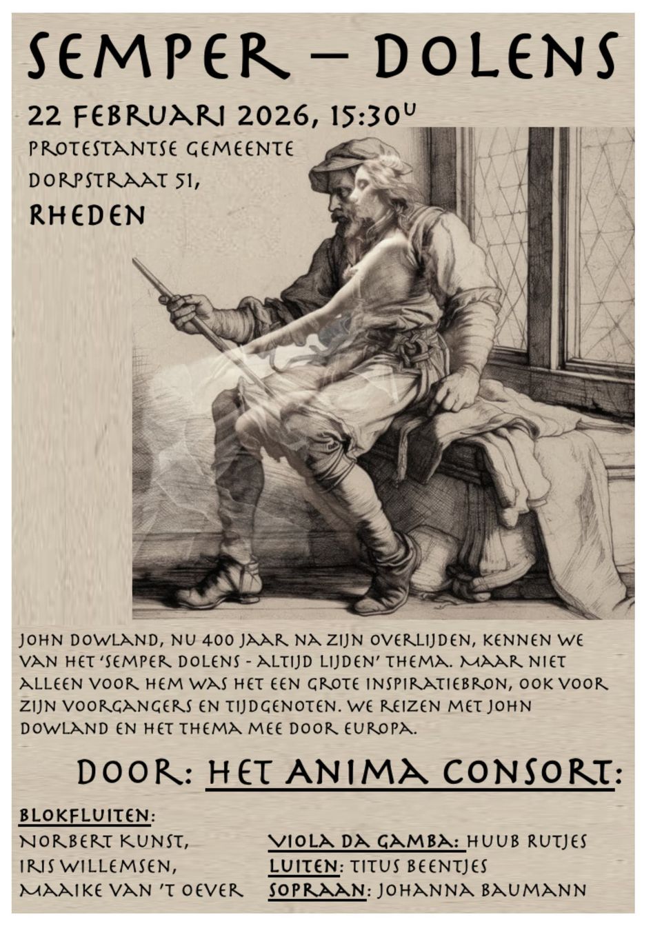 Op 22 februari geeft het Animo Consort een concert in de Dorpskerk van Rheden. In het concert staat de titel Semper Dolens (altijd lijden) centraal. Dit is het levensmotto van John Dowland, die op 20 februari 1626 (400 jaar geleden) is bijgeschreven in het begrafenisregister van St. Anna Blackfriars Church. John Dowland is voor zangers en fluitisten hedentendage een belangrijke componist. Zijn Semper Dolens staat centraal in het programma van vanmiddag en is exemplarisch voor zijn bijnaam : Master of melancholy. We kennen het als vijfstemmige compositie voor gambaconsort en als luitsolo. Het Anima Consort neemt u mee op een reis door Europa die Dowland ook heeft gemaakt. U zult horen dat het Dolens niet alleen voor hem een inspiratiebron is geweest. Het programma omvalt instumentale en vocale werken van verscheidene componisten uit de 16e en 17e eeuw.