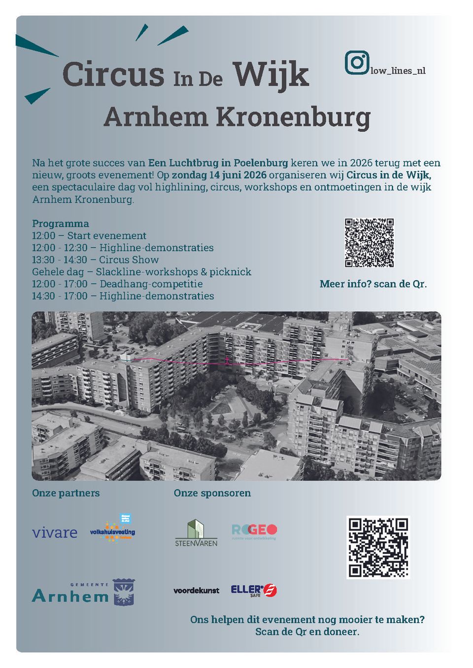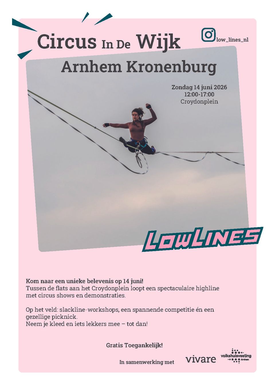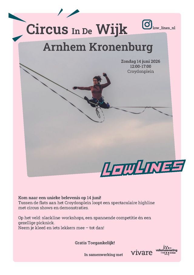 Het Lowlines collectief organiseert het project “Circus in de Wijk” op het Croydonplein in Kronenburg. Tijdens deze dag verandert het plein in een bijzonder podium, met als hoogtepunt een highline tussen de flats. Op grote hoogte balanceren circusartiesten en highline-atleten boven de wijk.