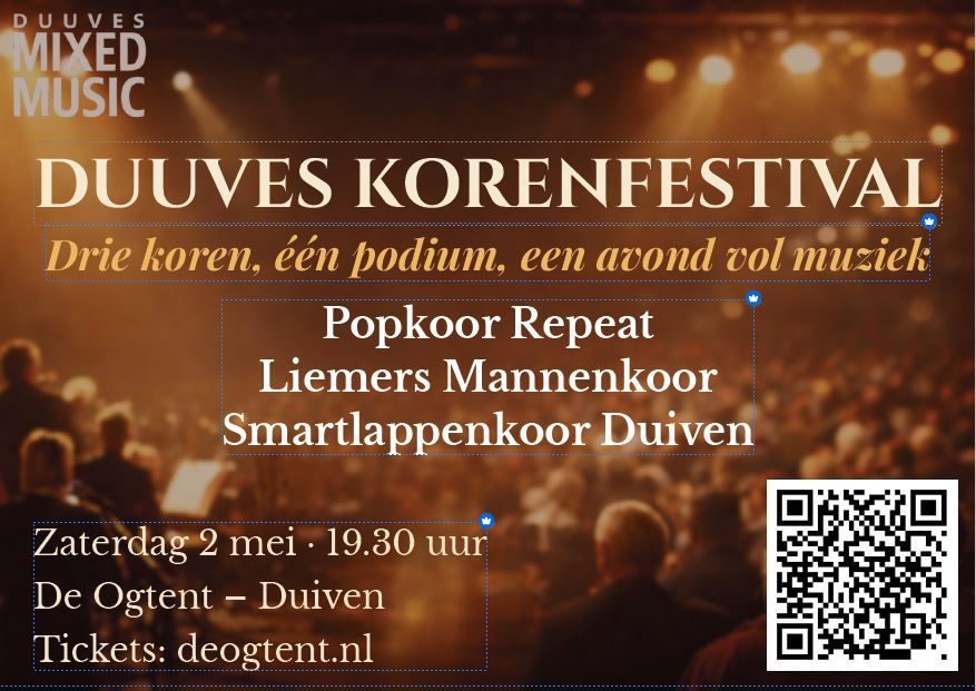 Op zaterdagavond 2 mei staat De Ogtent in het teken van samenzang tijdens het Duuves Korenfestival. Drie koren met ieder een eigen stijl verzorgen een afwisselende muzikale avond: Popkoor Repeat, Liemers Mannenkoor en Smartlappenkoor Duiven. Van meerstemmige popsongs en krachtige mannenkoorklanken tot gezellige Nederlandstalige meezingers. Er is voor ieder wat wils.