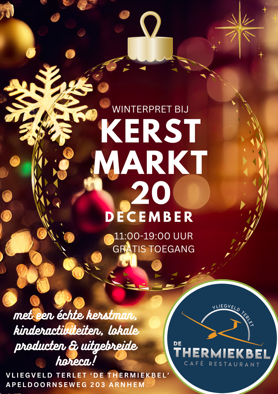 Welkom op de gezellige kleinschalige kerstmarkt op vliegveld Terlet! Bij restaurant De Thermiekbel is ook dit jaar weer een leuke kerstmarkt voor jong en oud. Er zijn gratis kinderactiviteiten én ontmoet een echte kerstman! Kom een kijkje nemen op deze leuke markt met lokale producten, een lekker hapje en drankje!