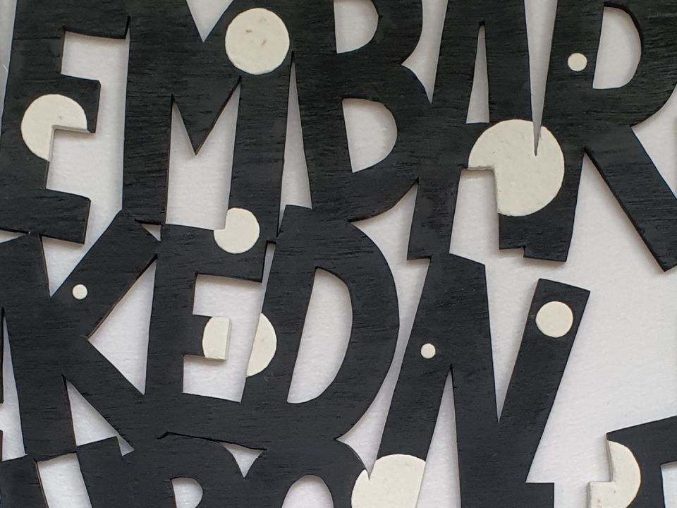 Nu wringen de patronen zich op en tussen de letters en vertekenen het woord. De leesbaarheid vecht tegen het beschermende bliksemafleidende uiterlijk vertoon.